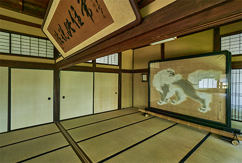 Myojyu-ji Kyakuden (reception hall) is the relocated residence of the Nabeshima family of the former Hasuike domain of Hizen Province, formerly located in Iikura Mamiana-cho, Azabu ward (now Azabudai, Minato ward). The main hall on the first floor is 24 tatami mats in size, with a 12-matted room next to it, surrounded by a veranda and a waist-high balustrade. While the hall is decorated in the Shoin (drawing room) style with a floor, shelves, and study space, it is designed to be a western-style room with glass shoji screens, a high ceiling, carpet on tatami floor, chairs, and tables.